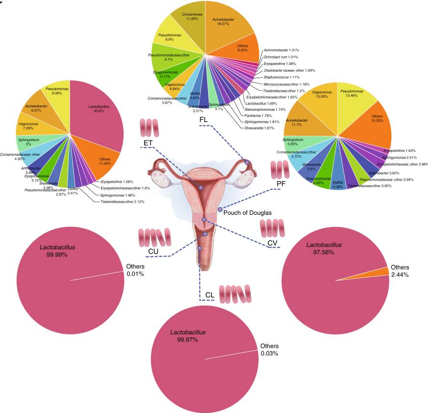 ある報告(Canha-Gouveia et al., Frontiers in Endocrinology, 2023)では、腟から子宮、卵管までの細菌叢を報告しており、腟内細菌叢においてはほぼ乳酸菌が占めており、子宮、卵管と上行するほど、乳酸菌の割合が減少し、細菌叢が多様化していくことを報告しています。